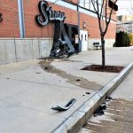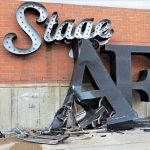 The large lighted sign on the side of the Stage AE concert venue on Pittsburgh’s North Shore was heavily damaged on Sunday after a vehicle jumped the curb and crashed into the building.