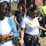 Cecelia Ware and Loleda Moman pray on Wednesday, April 20, 2022, during a prayer walk to the Airbnb unit on Pittsburgh’s North Side where two people were shot and killed and nine others wounded over the weekend.