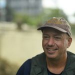Moore wears muck boots, shorts, a T-shirt, baseball cap and a personal flotation device.