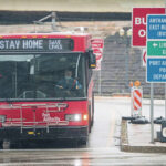 A Pittsburgh Regional Transit bus navigates the East Busway on April 30, 2020.