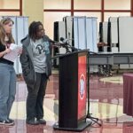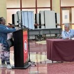Veronica Lavender, a parent of a Westinghouse Arts Academy student, adresses her concerns about the PRT student transportation to Penn Hills School Board members at the Aug. 21 meeting.