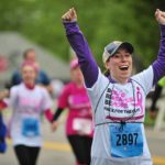 A runner celebrates as she nears the finish line of the 2018 Susan G. Komen Pittsburgh Race for the Cure 5K run in Schenley Park on Sunday, May 13, 2018.