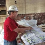 Neal Mehrenberg, a bricklayer with Marsa Inc., reviews a schematic showing the Wilkinsburg train station’s original interior furnishings, which will be restored and replaced.