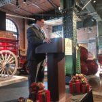 Mayor Bill Peduto (at podium) adresses the media while Santa Claus listens nearby at the news conference for Comcast Light Up Night on Nov. 6 at the Senator John Heinz History Center in the Strip District.