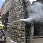 Foreman Tony Furtivo of Marsa Inc. Masonry Contractor pressure washes 122 years of grime from the outside of the Church of the Ascension in Shadyside on Tuesday. The church, which was built in 1898, was being cleaned and is undergoing masonry repairs.