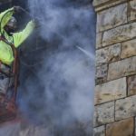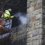 Tony Furtivo of Marsa Masonry cleans the exterior of Church of the Ascension Tuesday, May 12, 2020, in Pittsburgh’s Shadyside neighborhood.