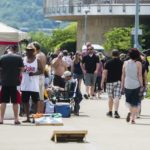 Lindsay Fisher, of South Hills, plays games with Aarron Sweeney, background, while tailgating outside Heinz Field on Saturday, May 18, 2019 while concert-goers prepare for the Garth Brooks performance that is set to begin at 7 p.m.