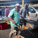 Chris Pennington of Wexford and Cory Atwood (right) of Kittanning prepare hamburgers on a grill in the parking lots outside Heinz Field on Saturday, May 18, 2019 while concert-goers prepare for the Garth Brooks show.