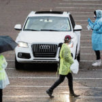 Drivers waited in line for hours to reach the testing site, where professionals in rain ponchos assisted patients during the downpour.