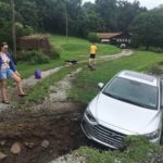 Della Wagasky of Plum, who lives along New Texas Road, examines damage from Sunday night’s flooding. Wagasky’s friend was visiting when the heavy rain struck, and when he tried to leave, the rushing water carried his car into the creek that runs through her property. Wagasky’s driveway was completely washed away.