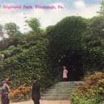 A postcard showing the Highland Park pedestrian tunnel in its early days. Note that the "h" is missing from the spelling of Pittsburgh at the top of the postcard. The "h" was removed in 1891 and restored in 1911.