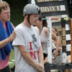 Biff Hutchison of Burley, Idaho, center, gets encouragement before his performance during Pogopalooza, The World Championships of Pogo in Wilkinsburg, Pa., Saturday, July 20, 2019.