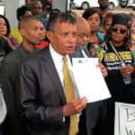 Tim Stevens, chairman and CEO of The Black Political Empowerment Project holds up a letter he sent to Allegheny County District Attorney Stephen A. Zappala Jr. For the third day in a row, people gathered to protest at a gas station in Pittsburgh’s Marshall-Shadeland neighborhood Monday, Sept. 23, 2019.
