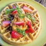 The menu offers chicken-n-waffles with Chipotle syrup, platters with cured meats, cheeses and duck confit, a fried bologna sandwich on Texas toast, a double burger with rosemary fries, and other items such as roasted chicken salad with dates and goat cheese or hummus with poached vegetables and flatbread.