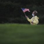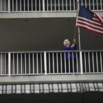 A resident of The Bower Hill at Mt. Lebanon waves an American flag as Neil Diamond plays on a nearby speaker during an “Afternoon Soiree” on Friday, April 24, 2020. Each day, at 5:30 p.m., resident and retired nurse Alice Oakes plays three songs through a speaker on her balcony for the enjoyment of her neighbors.