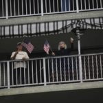 Residents of The Bower Hill at Mt. Lebanon wave flags and sing Neil Diamond songs from their balconies during an “Afternoon Soiree” on Friday, April 24, 2020. Each day, at 5:30 p.m., resident and retired nurse Alice Oakes plays three songs through a speaker on her balcony for the enjoyment of her neighbors.
