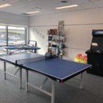 A cafe provides free breakfast and lunch. A room featuring a ping-pong table and other games lets employees relax from their focused, stressful jobs.