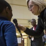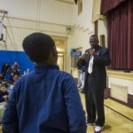 The students were familiar with Johnson’s life story. They asked him about a boyhood accident where he nearly burned his family’s home down trying to make rocket fuel in the kitchen.