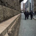 Pittsburgh Police officers walk the perimeter of Allegheny County Courthouse during the third day of the homicide trial of former East Pittsburgh Police officer Michael Rosfeld, Thursday, March 21, 2019. Rosfeld is charged in the fatal shooting of Antwon Rose II, who was unarmed, as he fled a felony traffic stop.