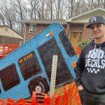 So he painted an 8 feet wide, 5 feet high piece of wood blue and wrote the bus number 6015. It’s the same as the bus that fell in the sinkhole. He calls his the “HP Flyer” for Holiday Park Drive.