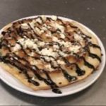 The “waffle,” which is about the size of a personal pan pizza, is then baked in an oven at 600 degrees and later topped with a balsamic glaze and feta and Parmesan cheeses.
