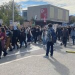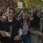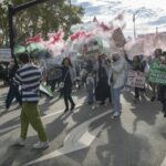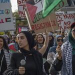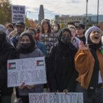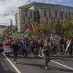 Protesters carried Palestinian flags and signs as they walked and chanted “Free, free Palestine.” Many wore scarves with the Palestinian flag.