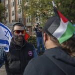 A man carrying an Israeli flag talks to a pro-Palestinian demonstrator in a rally near Pitt’s campus in Oakland on Oct. 13, 2023
