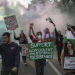 Demonstrators held Palestinian flags and signs with messages including “Resistance is Justified When People Are Occupied,” “Free Palestine” and “Stop Killing Gazans.”