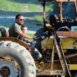 Ben Logan, with son Micah, 2, in tow, drives a tractor as he goes to mix feed at the Logan Family Farm in Hempfield on Aug. 12.