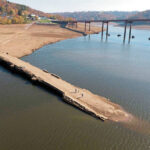 The very top of the Great Crossings Bridge becomes visible when the lake level is at 1,392 feet, and the bridge deck becomes exposed at 1,384 feet, according to Andrew Byrne, public affairs specialist for the Army Corps of Engineers’ Pittsburgh District, which oversees the lake and the flood control dam that created it.