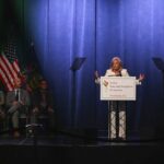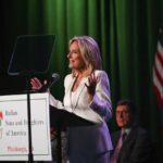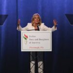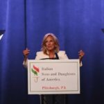 First lady Jill Biden delivers remarks during an Italian Sons and Daughters of America dinner at Rivers Casino in Pittsburgh on Saturday. Biden talked about her Italian heritage and the perseverance of Italian Americans during the brief speech. First lady Jill Biden delivers remarks during an Italian Sons and Daughters of America dinner at Rivers Casino in Pittsburgh on Saturday. Biden talked about her Italian heritage and the perseverance of Italian Americans during the brief speech.