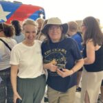 Rosei Rabish (left) of Richland Township and Jennifer Robbins (right) of Ross await the arrival of Kamala Harris and Tim Walz at the Wright Bros. Aero private hangar in Moon Township on Sunday.