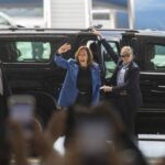 U.S. Vice President and Democratic presidential nominee Kamala Harris arrives for a campaign rally at Pittsburgh International Airport on Sunday.