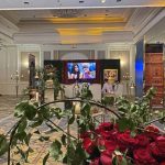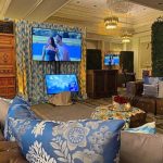 A large painting is displayed as you enter the Marquis Ballroom for the viewing parties. Each space is reserved for eight people. It costs $100, which includes drinks and hors d’oeuvres, or $500 to reserve the entire space for eight. There are free standing-room-only areas. The resort offers a discounted rate to extend a weekend stay to Monday.