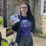 Khadija Djellouli, 30, of Beechview, is a poll watcher with the Ashley Comans campaign Tuesday morning, April 23, 2024, at St. Paul Baptist Church on Penn Avenue in Point Breeze.