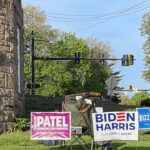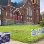 Campaign signs are posted across the lawn Tuesday near St. Paul Baptist Church in Point Breeze.