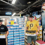 Owner Frank Mesich (left), and manager Alec Smith, carry cases of Platform Beer Co.’s Torte, a beer inspired by Prant’s Burnt Almond Torte cake, at Pittsburgh Street Beverage in Greensburg, on Thursday, April 18, 2019.