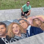North Huntingdon artist Erik Greenawalt poses with his rendering of the cast of the CBC Television series, “Schitt’s Creek.”