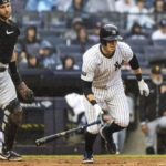 New York Yankees Ben Rice, right, runs to first base after hitting a fly out during the third inning of a baseball game against the Pittsburgh Pirates, Sunday, Sept. 29, 2024, in New York.