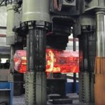 Hunks of steel weighing 190,000 pounds each are heated until they glow at 2300 degrees, and then slowly pounded into the rough shape of a propulsion shaft for a Navy submarine at a New Castle forge.