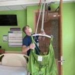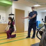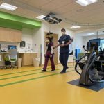 Katelyn Kelly, an occupational therapist, was strapped into the Zero G harness to demonstrate the support it provides for patients working on their mobility. She walked, did lunges and did a free fall while the system held her steady and monitored her activity.