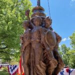 A flagpole rises above the 6-foot-tall bronze sculpture, which was crafted by Pittsburgh artist Frank Vittor and includes a statue of Columbia, the personification of America; a mother and son; a returned soldier about to be crowned with laurels; the allegorical figure of Victory clutching a wreath; and a depiction of Immortality.