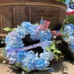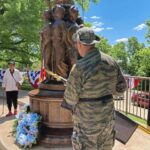 Gaines and Trumbull joined local officials in a ceremony that included lifting the new flag while a trumpet played Taps. Local dignitaries joined students in presenting wreaths to the memorial. A band of Obama Academy students played the national anthem, and local Vietnam veterans presented flags.