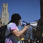 An event organizer who identified himself only as Jake speaks during a “Stop Asian Hate” rally in Pittsburgh’s Oakland section on Saturday, March 20, 2021. The rally was held to protest the increase in hate crimes against Asian Americans.