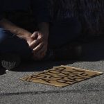 The sun illuminates a sign during a “Stop Asian Hate” rally in Pittsburgh’s Oakland section on Saturday, March 20, 2021. The rally was held to protest the increase in hate crimes against Asian Americans.