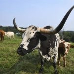 Jeremy Kronz ducks and dodges as he sprinkles nugget treats around the grassland for Texas Longhorn cattle to gobble up.