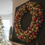 A 42-inch wreath hangs above a fireplace fashioned from colorful vintage ornaments from the owners’ moms.