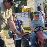 Wade Sokol, 3, of East Huntingdon Township, gets some advice from Phill Abbott of Coal Center as he takes his turn in the pedal tractor pull competition on Thursday, July 18, 2024 at the Sewickley Township Community Fair.