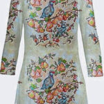 Fadden modeled one of her dresses featuring a bird motif with rich, fall hues and a partridge and pear tree theme.