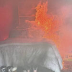 When a firefighter lit the bedsheets to begin the demonstration, the bed was fully consumed by flames in seconds. The rubber boots seemed to accelerate the blaze like gasoline.